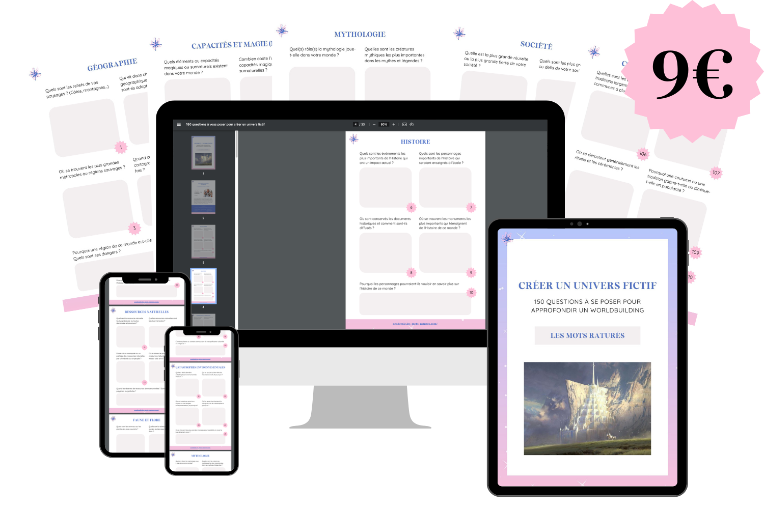 Créer un univers imaginaire est à la fois une étape exaltante et effrayante. Comment faire pour rendre son worldbuilding réaliste ? Quels points travailler ? Que doit-on approfondir ? Dans ce workbook, retrouve 150 questions que tu devrais te poser pour créer le worldbuilding de ton monde imaginaire.