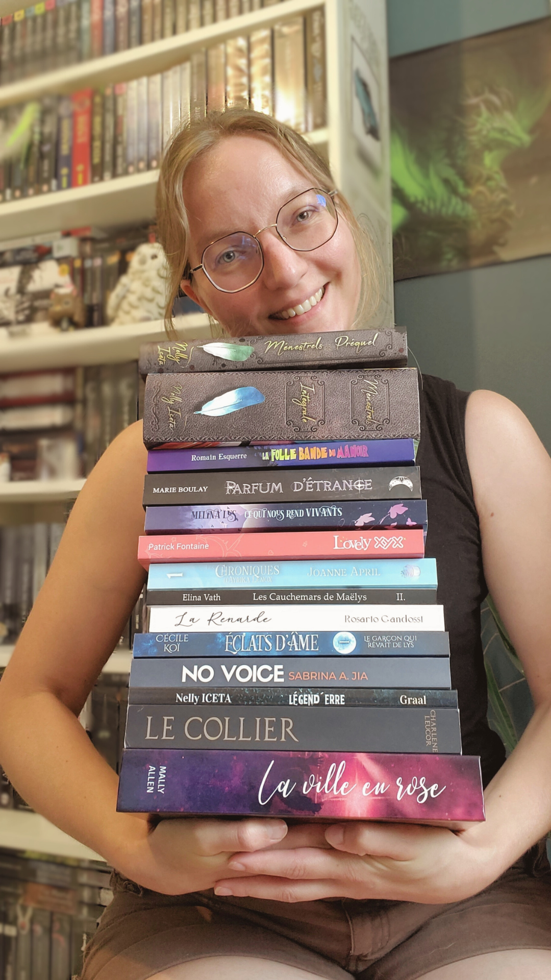Du matin au soir, elle travaille, se détend et rêve « livres », puisqu’elle passe aussi le week-end à écrire ses propres romans dans les genres de l’imaginaire et de la romance. Ça, c’est quand sa chienne et son chat baveux ne l’empêchent pas d’avancer. Et qu’ils ne boivent pas dans son thé…