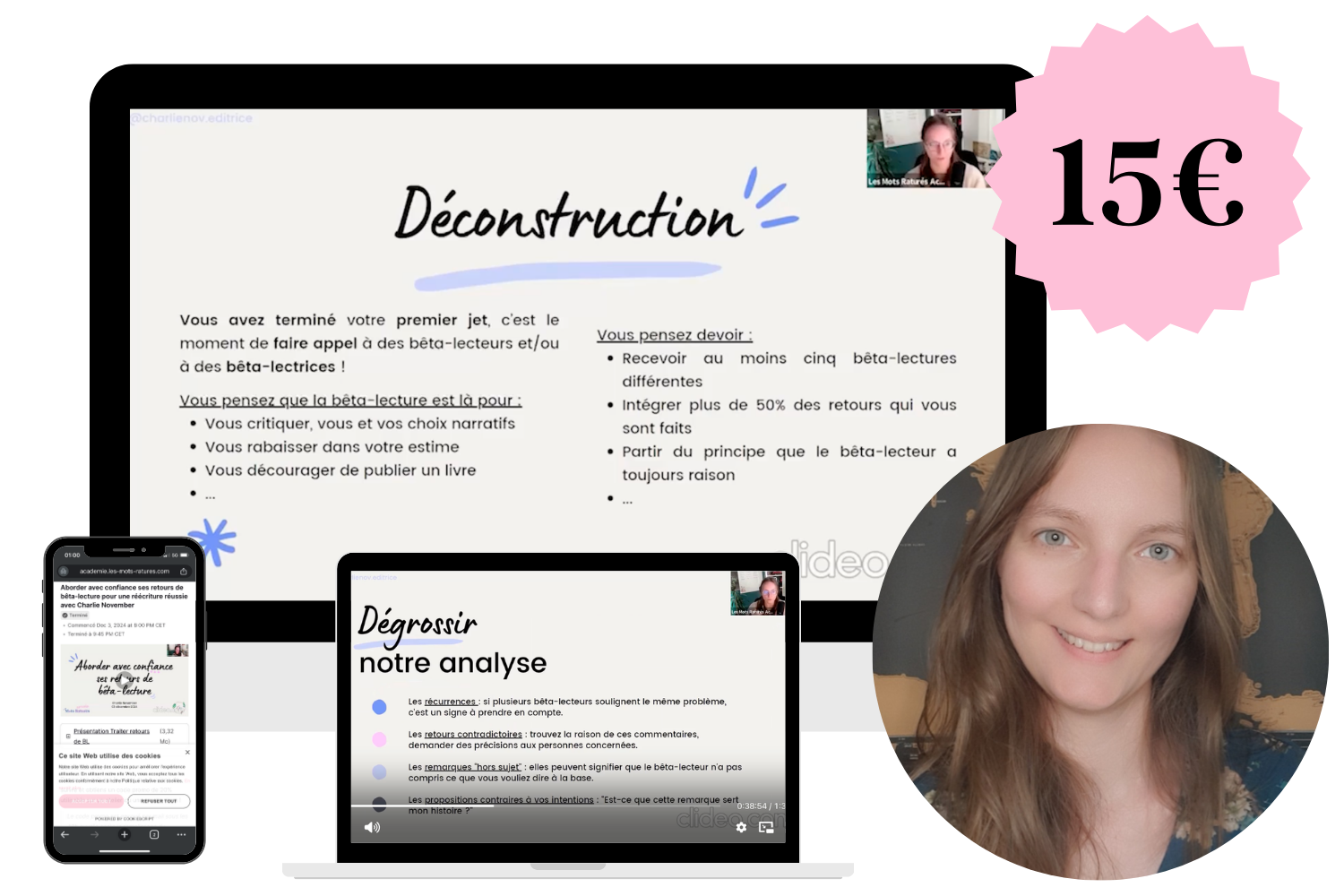 C’est justement là que Charlie November interviendra : professionnelle de l’accompagnement des auteurs et autrices, elle propose une approche claire pour traiter les retours de bêta-lecture de façon sereine et efficace. Dans cette masterclass, elle guidera les participants pas à pas pour qu’ils apprennent à analyser les retours avec discernement, à prioriser les changements pertinents, à laisser de côté ceux qui sont contraires à leurs intentions, et à cultiver une approche positive de la critique.