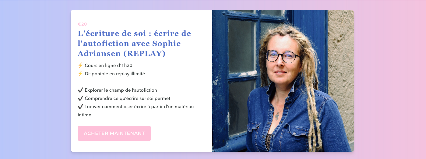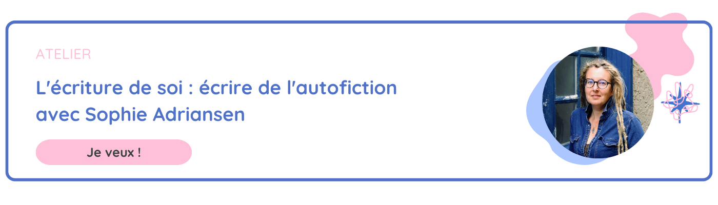 "L'écriture de soi : écrire de l'autofiction avec Sophie Adriansen" : un atelier en ligne que notre académie propose. Sophie Adriansen a eu recours à l’autofiction à plusieurs reprises et vous propose dans cet atelier de vous donner les clefs pour mieux comprendre ce genre si particulier.