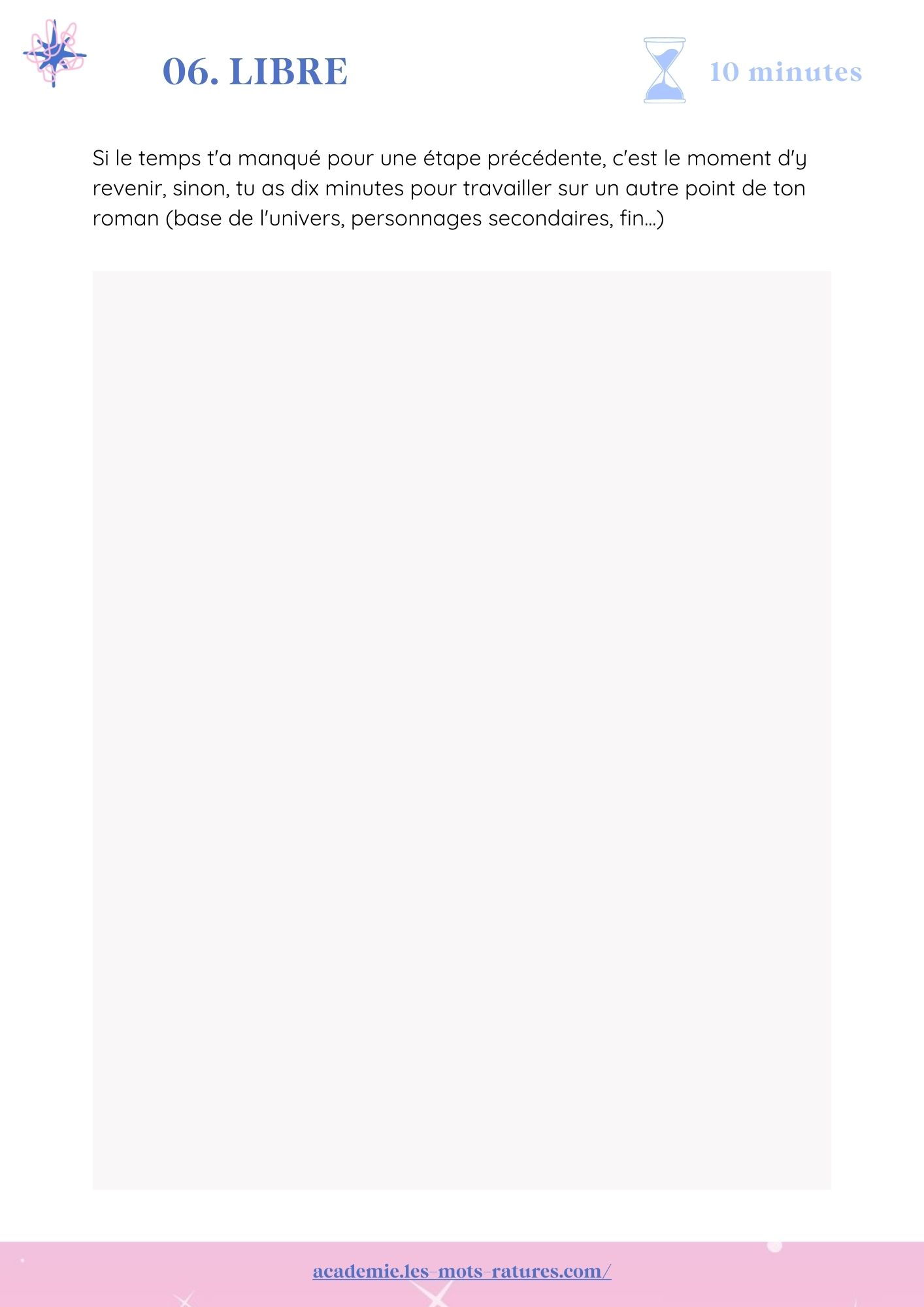 ✔️ Une méthode étape par étape pour clarifier tes idées, définir tes arcs narratifs et poser les grandes lignes de ton histoire.